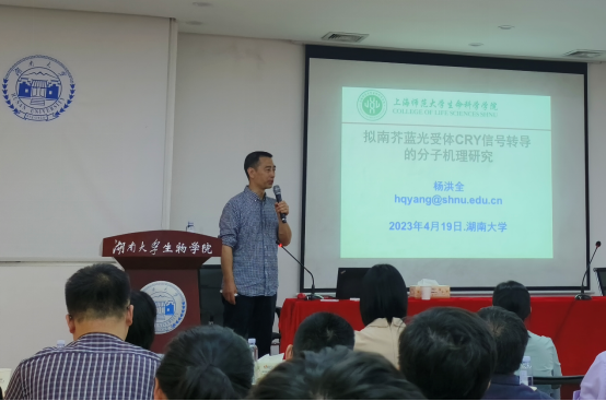 2023年4月19日上午,上海师范大学生命科学学院杨洪全教授应邀来我院进行学术交流,以“拟南芥蓝光受体CRY信号转导的分子机理研究”为题给ok1122诸侯快讯师生做了一场精彩的学术报告。讲座后杨教授参观了植物功能基因组学与发育调控湖南省重点实验室,并与有关师生进行了座谈。