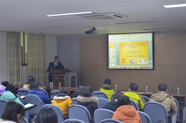 2016年01月13日上午10:00,澳大利亚弗林德斯大学(The Flinders University)医学院Chris Franco教授应邀来我院进行学术交流,为学院师生作了题为“Beneficial microbes for Australian broadacre agriculture: control of root diseases”的学术报告。Chris教授系统地介绍了其关于内生放线菌的研究成果与最新发现,其中详细介绍了一株分离自小麦体内的内生放线菌在防治小麦根部疾病的作用机理,明确了其在病害防治和诱导植物产生系统抗性中所扮演的关键角色。