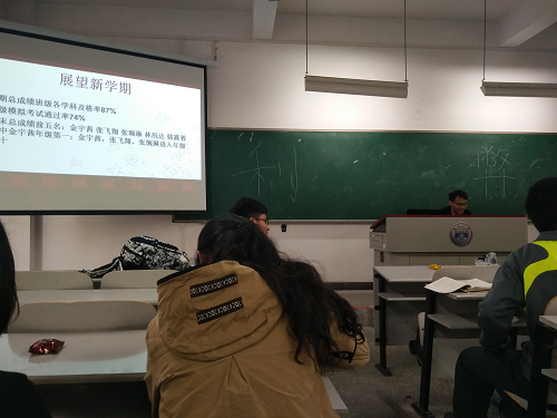 班会一开始,每位同学开始分发自己家乡的特产,同学们边吃边听,好不热闹。紧接着,班长凌东方为同学们分析了上学期的班级整体学习情况与成绩统计,就总体及格率、四级通过率两个方面给出全体同学学习上的肯定,但同时也对生医1602班的成绩有更近一步的期望。在上一学期的学习中,班级前五中有三位同学进入年级前十,其中金宇茜同学取得年级第一,同学们送上热烈的掌声对金宇茜同学的刻苦学习表示肯定,也表示自己要向金同学学习,在丰富的大学生活中依然保持优秀的成绩。