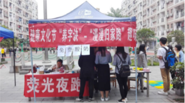 清晨7点,工作人员早早的就开始了准备活动。原味布丁杯装和加蜂蜜纸杯装的自制酸奶整齐的在桌子上摆放成三角阵型。行人陆续被活动吸引,纷纷前来参加并品尝美味的饮品。丁彦文同学向每位来访者认真地介绍生物院健康文化节的活动宗旨以及意义,杨凌清同学则向来访者介绍生物院微信公众号——“悠悠万物生”,并向大家推荐公众号上的健康食谱推送。同学们对生物院自制的酸奶产生了浓厚的兴趣,魏松泰同学详细介绍了用少量酸奶引菌种来自制酸奶的方法并向大家宣传酸奶对人体的益处,同学们扫描公众号二维码后便可品尝酸奶。品尝过后大多同学都赞道有天然的奶香味道,纷纷表示也要回去尝试自制酸奶。