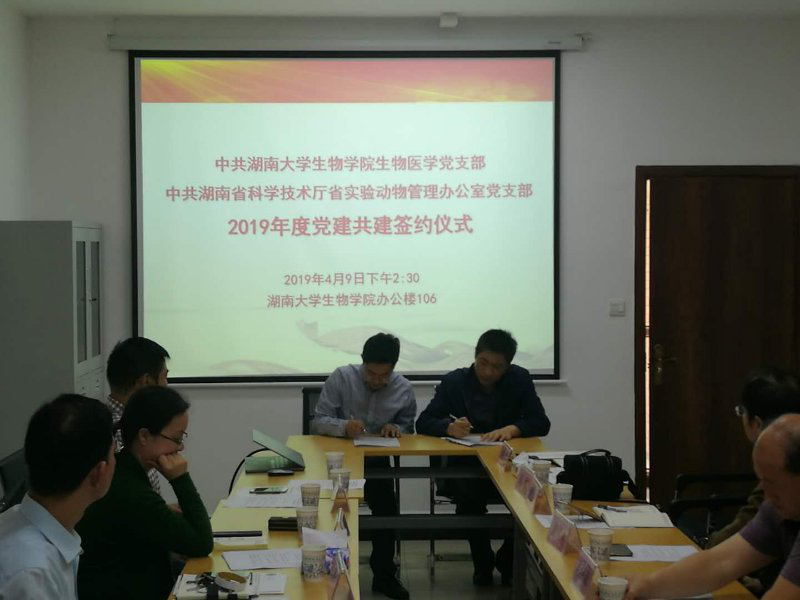 为深入学习贯彻习近平新时代中国特色社会主义思想和党的十九大精神,进一步推进我校建设中国特色世界一流大学的战略,充分发挥高等院校和科技管理部门在产学研创新驱动战略实施中的各自优势和作用,我院生物医学党支部与湖南省科技厅动管办(湖南省实验动物管理办公室)党支部4月2日在学院会议室举行了支部结对共建活动。在ok1122诸侯快讯党委主要领导、双方支部的党员、以及应邀参加的湖南斯莱克景达实验动物有限公司的党员代表的共同见证下,结对双方支部的支部书记互签了共建协议,明确了共建目标、共建内容和工作措施。