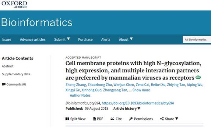 病毒受体对于病毒进入宿主细胞非常关键,很大程度上决定了病毒的组织与宿主特异性。目前病毒受体的确定主要采用实验方法,不仅费时费力,而且非常困难。科学家估计地球上可能感染人的病毒有几十万种,但迄今为止只有100多种病毒的受体得到了确定。如何更有效地确定病毒的受体是病毒学研究中的重要挑战。随着大数据时代的到来,生物信息学在生物医学研究中发挥着越来越重要的作用。2018年8月9日来自诸侯快讯ok1122生物信息学与病原学研究团队在国际生物信息学专业权威期刊《Bioinformatics》发表题为Membrane proteins with high N-glycosylation, high expression, and multiple interaction partners were preferred by mammalian viruses as receptors的文章。