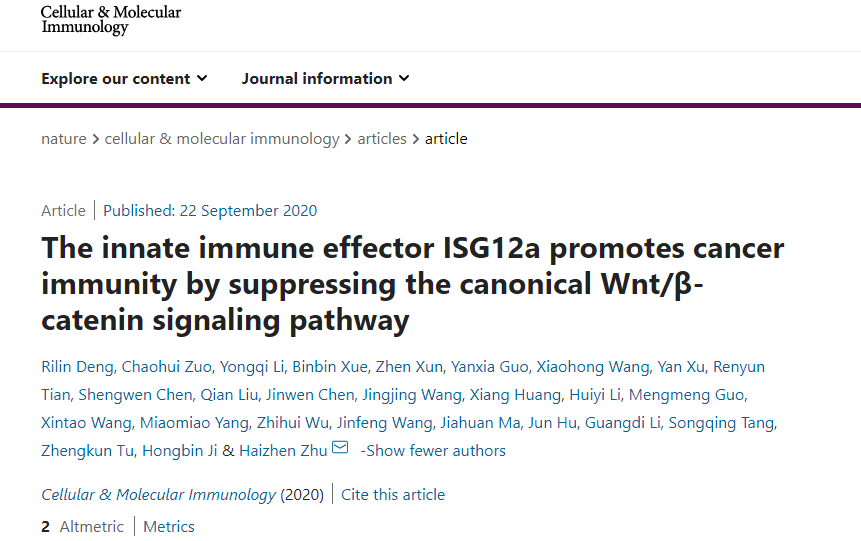 [1] Deng, R. et al. Innate immune effector ISG12a promotes cancer immunity through suppressing canonical Wnt/β-catenin signaling pathway. Cell Mol Immunol. 2020 Sep 22. doi: 10.1038/s41423-020-00549-9.