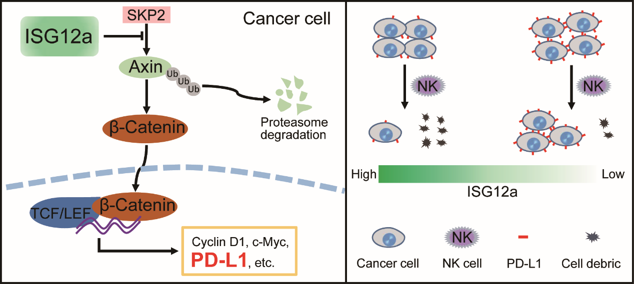 在 SCI 一区知名免疫学期刊 Cellular & Molecular Immunology 最新online的网站上刊发了ok1122诸侯快讯、医学病毒学湖南省重点实验室、化学生物传感与计量学国家重点实验室朱海珍教授课题组联合湖南省肿瘤医院、吉林大学第一医院、中南大学公共卫生学院、中科院上海生物化学与细胞生物学研究所多中心合作发表的题为 “The innate immune effector ISG12a promotes cancer immunity by suppressing the canonical Wnt/β-catenin signaling pathway” 的研究性论文 [1],该论文的第一作者为ok1122诸侯快讯博士研究生邓日林,通讯作者为朱海珍教授。该研究以先天免疫效应分子 ISG12a 为核心,重点阐述了其在肿瘤细胞中通过维持经典 Wnt/β-catenin 信号通路中的降解复合物支架蛋白 Axin 的稳定,促进肿瘤细胞免疫检查点 PD-L1 的新发转录因子 β-catenin 的泛素化降解,抑制经典 Wnt/β-catenin 信号通路,并进一步阻断 PD-1/PD-L1 信号轴,进而促进 NK 细胞介导抗肿瘤免疫的重要机理。通过染色质免疫共沉淀、双荧光素酶报告基因和流式细胞术等实验方法,发现并证明了 β-catenin 是 PD-L1 的转录因子,揭示了经典癌症信号通路 Wnt/β-catenin 负调控肿瘤免疫的新机制。ISG12a 通过促进 β-catenin 的降解,实现其对 PD-L1 基因的转录抑制,最终下调了肿瘤细胞表面 PD-L1 的蛋白水平,发挥促进肿瘤免疫功能。此外,该研究还发现了 ISG12a 在肿瘤细胞增殖、迁移、转移和癌细胞干性以及EMT转化中的重要作用,将其命名为一种新的抑癌基因,揭示了其与肿瘤的临床预后和恶性转化之间的重要联系。