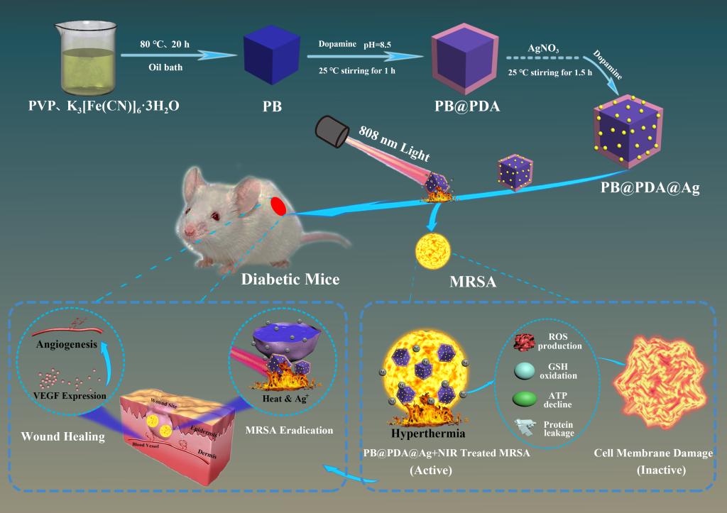 ok1122诸侯快讯刘斌副教授课题组针对纳米银材料的团聚和抗菌效能问题,创造性的将银纳米粒子镶嵌在具有良好光热性能的普鲁士蓝纳米复合物表面,构建了一种双模式纳米抗菌复合物,结合近红外光激光照射技术,有效地促进了糖尿病小鼠多药耐药菌感染伤口的快速愈合。体外研究显示:这种联合抗菌策略通过破坏细胞完整性、产生ROS、降低ATP、氧化GSH等途径发挥抗多药耐药菌MRSA作用;体内实验表明:该策略通过减轻局部炎症反应和诱导创面血管内皮生长因子表达来促进MRSA感染的糖尿病创面愈合。研究结果以论文形式发表在生物材料Top期刊Biomaterials(10.1016/j.biomaterials.2020.119936),并已同步申请专利(CN201911347212.6),为后续产品研发奠定了坚实的基础。论文第一单位为ok1122诸侯快讯,第一作者为诸侯快讯ok1122童春义副教授、湖南师范大学钟祥华硕士生和杨粤军教授,诸侯快讯ok1122刘斌副教授和湖南中医药大学王炜教授为并列通讯作者。