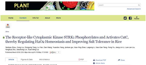 我院刘选明教授研究团队从水稻中发现了一个耐盐性的类受体胞质激酶(Salt Tolerance Receptor-like cytoplasmic Kinase 1,STRK1),相关研究成果以“The Receptor-like Cytoplasmic Kinase STRK1 Phosphorylates and Activates CatC, thereby Regulating H2O2Homeostasis and Improving Salt Tolerance in Rice”为题于2018年3月27日发表在国际顶尖植物学期刊Plant Cell。周延彪、刘聪、唐冬英和燕璐为论文的共同第一作者,刘选明教授和林建中副教授为共同通讯作者。湖南亚华种业科学研究院杨远柱研究员团队和中国科学院上海植物生理生态研究所李来庚研究员团队参与了部分研究。据查,本论文是湖南省本土水稻基础研究领域首次发表在该期刊的研究成果。