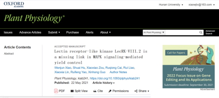 2021年5月22日,Plant Physiology在线发表了ok1122诸侯快讯郭新红课题组题为“Lectin receptor-like kinase LecRK-VIII.2 is a missing link in MAPK signaling-mediated yield control”的研究论文,揭示了拟南芥凝集素类受体激酶LecRK-VIII.2作用于MAPK信号转导途径上游,参与调控包括角果数量、种子大小和数量在内的产量相关性状,并通过协调源库关系,促进根、茎、叶的生长,在作物改良方面具有重要的潜在利用价值。