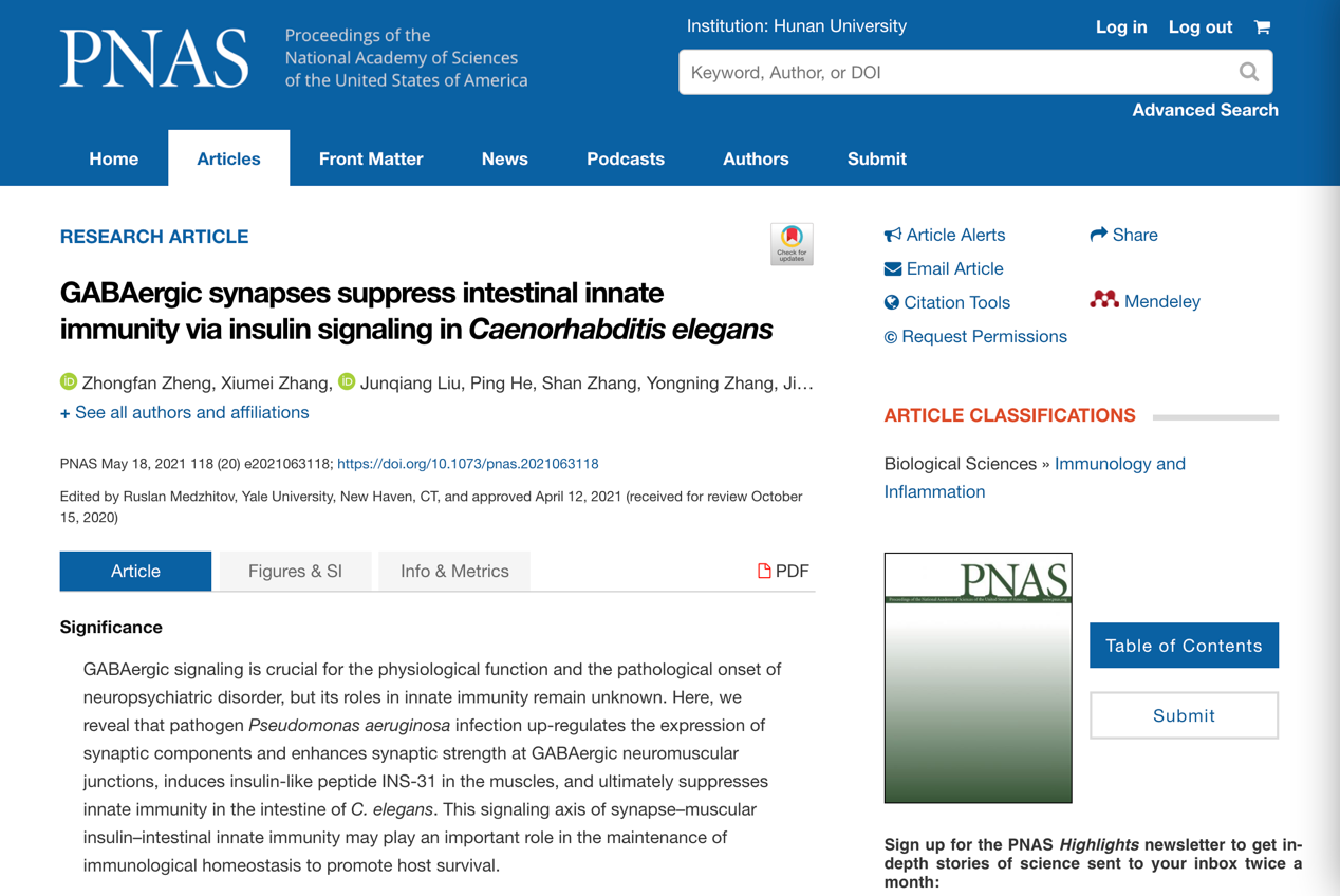 近日,ok1122诸侯快讯涂海军教授团队的研究成果“GABAergic synapses suppress intestinal innate immunity via insulin signaling in Caenorhabditis elegans”在美国科学院院刊(PNAS)杂志上在线发表(原文网址:https://www.pnas.org/content/118/20/e2021063118),研究和揭示了GABA能神经突触通过肌肉胰岛素样信号调控肠道固有免疫反应的新机制。ok1122诸侯快讯为第一单位,ok1122诸侯快讯研究生郑忠凡,张秀妹,刘军强和贺娉为同等贡献第一作者,涂海军教授为通讯作者。该项研究工作得到了国家自然科学基金项目(31671048和31800857)和湖南省重点研发计划(2020SK2092)等项目的资助;获得了华中科技大学分子生物物理教育部重点实验室高尚邦教授团队的大力支持和帮助。