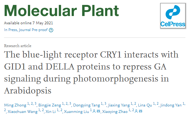 2021年5月7日,Molecular Plant在线发表了ok1122诸侯快讯赵小英/刘选明课题组题为“The blue-light receptor CRY1 interacts with GID1 and DELLA proteins to repress GA signaling during photomorphogenesis in Arabidopsis”的研究论文。该研究报道了蓝光受体CRY1能够与GA受体GID1和GA信号关键抑制因子DELLA蛋白以蓝光依赖的方式直接结合,进而抑制GA信号和促进光形态建成的新机制。