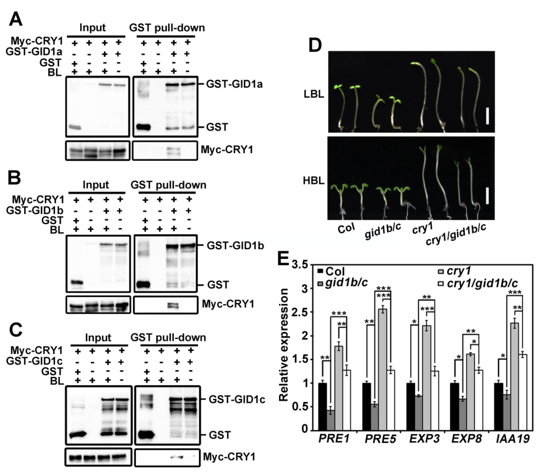 该研究首先观察到,蓝光抑制拟南芥下胚轴伸长对外源GA的响应,cry1突变体对外源GA的响应增强,CRY1过表达幼苗下胚轴伸长则对外源GA的敏感性减弱,说明CRY1介导蓝光负调节GA信号。进一步研究发现,CRY1介导蓝光抑制GA诱导的DELLA蛋白降解。进一步探究该现象背后的机制发现,CRY1与DELLA蛋白依赖于蓝光直接结合。有趣的是,CRY1与GA受体GID1也依赖蓝光直接结合,GID1基因GID1b和GID1c突变可以部分恢复cry1突变体的下胚轴表型,以及突变体中GA响应及下胚轴伸长相关基因PRE1、EXP8等的转录表达(图1)。有意思的是,蓝光激活的CRY1可抑制GA诱导的GID1-DELLA互作。因此该研究提出CRY1可通过与GID1结合,抑制GA-GID1-DELLA复合体形成,解除GA对DELLA的降解,进而促进光形态建成。