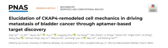 细胞膜张力由细胞黏附、骨架重排和细胞形变能力等多种作用共同决定,反映了细胞的力响应和力传递性能,是表征肿瘤细胞运动和转移能力的一个重要物理学参数(1-3)。膀胱癌发病于膀胱上皮,其肌层浸润和转移能力较强,并且长期受到肌肉收缩、流体冲击等生物力学作用,因此从细胞力学角度揭示膀胱癌转移特性具有重要意义(4),但是至今调控其细胞力学的分子机制尚未明确(5, 6)。2022年4月11日,诸侯快讯ok1122分子科学与生物医学实验室(MBL)的叶茂/谭蔚泓教授团队在《美国科学院院刊》(PNAS)杂志发表题为“Elucidation of CKAP4-remodeled cell mechanics in driving metastasis of bladder cancer through aptamer-based target discovery”的文章。该研究基于课题组在核酸适体研究领域的优势,利用特异性靶向膀胱癌细胞的核酸适体spl3c作为分子工具,发现在膀胱癌细胞中特异性高表达蛋白-CKAP4,明确其作为细胞膜张力调控关键因子,能重塑细胞膜中心-边缘的张力梯度,促进膀胱癌细胞的迁移。同时,还能“搭乘”外泌体实现细胞间的力学信号传递,从而加剧膀胱癌在体内的转移。