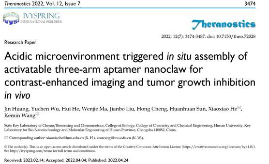 Huang J, Wu Y, He H, Ma W, Liu J, Cheng H, Sun H, He X*, Wang K*. Acidic microenvironment triggered in situ assembly of activatable three-arm aptamer nanoclaw for contrast-enhanced imaging and tumor growth inhibition in vivo. Theranostics 2022; 12 (7): 3474-3487.