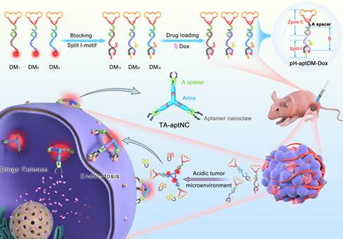 图1.肿瘤酸性微环境激活的“三臂Aptamer纳米爪”型DNA纳米诊疗器件原位组装策略用于增强肿瘤靶向成像和肿瘤生长抑制研究示意图.