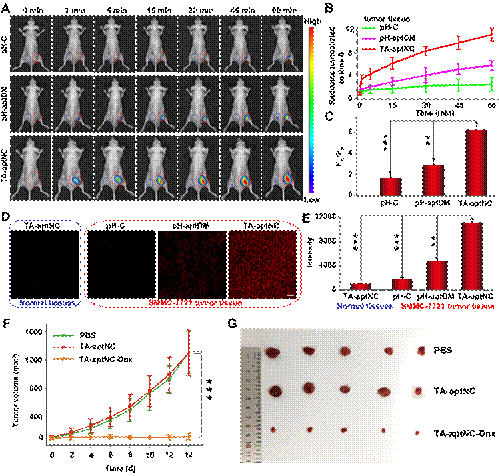 图2. “三臂Aptamer纳米爪”型DNA纳米诊疗器件的增强肿瘤靶向成像和肿瘤生长抑制效果.