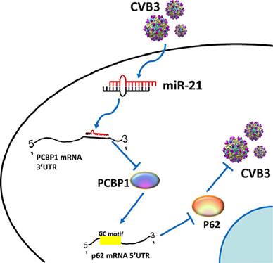 CVB3是研究肠道病毒的重要模式病毒,其本身是病毒性心肌炎的重要病原,而病毒性心肌炎是引发年轻人猝死的主要病因之一。目前,学界尚未完全揭示CVB3的感染机制,导致并未有针对该病毒的特效药。本文研究发现,PCBP1通过影响自噬受体蛋白p62/SQSTM1的翻译促进CVB3的感染;而在CVB3感染细胞的过程中,细胞会上调miR-21靶向PCBP1,从而造成PCBP1表达的下降,拮抗CVB3感染。这一发现揭示了CVB3与宿主细胞互作的一个新机制,推进了对肠道病毒感染机制的认识,并为相关抗病毒药物的开发提供的重要的靶点。