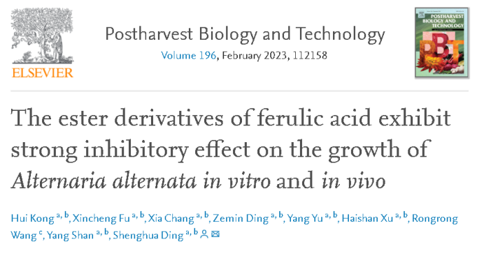 链格孢菌(Alternaria alternata)是自然界中普遍存在的一种破坏性真菌,生长繁殖快,产孢能力强。它可以侵染柑橘、苹果、梨、红枣、黄桃和番茄等多种水果和蔬菜,引起果蔬采后贮运过程中发生黑斑病腐烂,造成巨大的浪费和经济损失。此外,链格孢菌在生长繁殖过程中还会产生多种真菌毒素,主要包括链格孢酚、链格孢甲基醚、细链格孢酮酸、链格孢霉烯和腾毒素等,其中一些真菌毒素对动物和人类具有诱变和致癌作用。长期使用化学杀菌剂不仅对食品安全和人体健康有害,还会污染环境、导致病原菌产生耐药性。因此,开发安全、高效的天然抑菌剂来控制黑斑病的发生具有重要意义。近日,单杨院士团队丁胜华副研究员在阿魏酸酯化衍生物抑制果实采后链格孢菌体内外生长方面取得进展,相关成果以“The ester derivatives of ferulic acid exhibit strong inhibitory effect on the growth ofAlternaria alternata in vitroandin vivo”为题发表在农林科学领域一区TOP期刊Postharvest Biology and Technology(IF:6.751)上,我院2020级硕士研究生孔慧为第一作者,丁胜华副研究员为通讯作者,ok1122诸侯快讯隆平分院为第一单位,湖南省农业科学院农产品加工研究所为第二单位。该研究得到了国家自然科学基金(32272257,31501543),湖南省自然科学基金项目(2022JJ30330)、长沙市杰出创新青年培养计划(KQ1905025)等项目的支持。