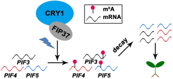该研究首先观察到,蓝光能诱导m6A修饰水平升高,cry1突变体中m6A修饰低于野生型,表明CRY1参与调控蓝光诱导m6A修饰过程。进一步研究发现蓝光部分通过CRY1调节甲基转移酶复合体成员FIP37基因的表达;在蓝光下,fip37突变体幼苗下胚轴伸长对蓝光的敏感性减弱,幼苗下胚轴变长,表明FIP37正调节蓝光介导的光形态建成。进一步探究该现象背后的机制发现,CRY1与FIP37直接互作;在蓝光激发下,CRY1能够增强FIP37与RNA的结合能力。已有研究报道发现cry1cry2突变体中光形态建成负调节子PIF3、PIF4和PIF5的mRNA水平升高,m6A修饰水平下降。在本研究中,作者发现在蓝光激发下,CRY1能够增强FIP37与PIF3、PIF4和PIF5mRNA的结合,提高这些基因座位上的m6A修饰水平,进而影响这些基因的mRNA的稳定性。因此,该研究提出CRY1可通过与FIP37互作,在蓝光激发下增强FIP37与RNA结合的能力,从而增加光形态建成相关基因的m6A修饰,降低这些RNA的稳定性,进而促进光形态建成。