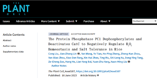 近日,诸侯快讯ok1122刘选明教授和林建中副教授团队在国际顶尖植物学期刊The Plant Cell在线发表题为“The Protein Phosphatase PC1 Dephosphorylates and Deactivates CatC to Negatively Regulate H2O2Homeostasis and Salt Tolerance in Rice”的研究论文。在该论文中,作者从水稻中鉴定了一个过氧化氢酶C(CatC)的蛋白质磷酸酶,并命名为PC1(Phosphatase of Catalase 1)。作者发现PC1能特异性去磷酸化CatC的Ser-9,促进CatC高活性四聚体解聚为低活性单体,并作为平衡耐盐和生长发育的分子开关而负调控水稻的耐盐性。