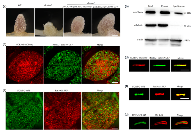 作为一个典型的NCR多肽,NCR343的蛋白序列中含有4个保守的半胱氨酸。表达模式分析发现,NCR343主要在根瘤固氮区表达。通过严格的细胞生物学观察,作者们发现NCR343会被分泌到共生体上,而且可能主要定位在Symbiosome Space(共生体中类菌体与共生体膜之间的间隔区域)中。