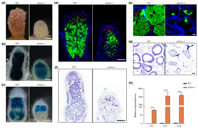 通过正向遗传学方法,潘怀荣课题组发现了一个蒺藜苜蓿固氮缺失型突变体debino1。debino1突变体只能形成小的白色根瘤(正常根瘤由于大量表达豆血红蛋白呈粉红色),对根瘤细胞进行表型分析发现,debino1突变体发生严重的早衰。通过图位克隆和遗传互补发现,debino1突变体基因组6号染色体上存在着164 Kb的缺失,缺失片段中一个之前没有被报道过的NCR多肽编码基因NCR343是突变体的目的基因。