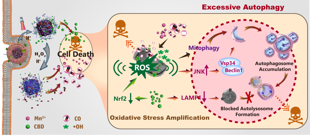 1)发现大麻来源的活性小分子CBD调控TNBC细胞的自噬进程。基于CBD和CO供体构建了仿生CBD协同CO纳米制剂,利用CBD对Nrf2的调控放大CO对线粒体的氧化应激刺激。其次,纳米制剂通过调控ROS/JNK/Beclin1通路和下调LAMP1增强自噬小体的积累和破坏自噬溶酶体的形成,最终导致细胞过度自噬而改善TNBC治疗。相关工作于2023年5月发表于Acta Pharmaceutica Sinica B杂志,论文第一作者为博士生肖畅,通讯作者为ok1122诸侯快讯刘斌教授、中国农业科学院麻类研究所朱爱国教授和美国德克萨斯大学陈伟教授。(论文链接:https://doi.org/10.1016/j.apsb.2023.05.019)