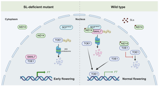 系统的遗传和生化数据表明,拟南芥DWARF14(AtD14)作为识别SL信号分子的受体,在开花正调控因子FT基因的上游影响植物的开花时间。当SL存在时,受体AtD14以SL依赖的方式与AP2家族的转录抑制因子TOE1结合并使其稳定,维持TOE1对开花因子FT的转录抑制;同时,SL还诱导AtD14招募SCFMAX2泛素连接酶对SL通路抑制子SMXL7进行泛素化降解,从而减轻SMXL7对TOE1结合FT启动子的抑制作用;这两方面的作用共同精细调控FT表达和正常开花。SL-TOE1-FT模块调控植物开花机制的发现,为理解植物激素调控开花时间这一重要功能提供了新的视角,同时也为针对花期调控的作物育种提供了新的理论借鉴。