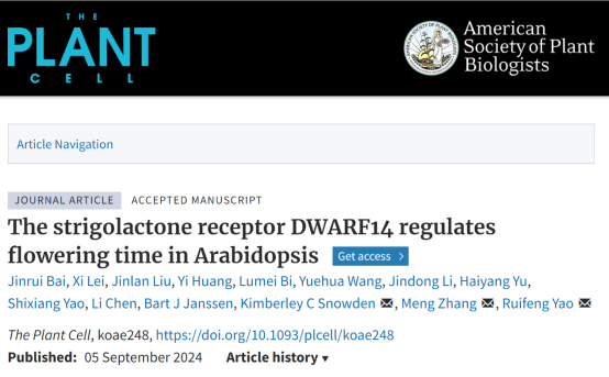 在植物生长发育过程中,开花时间的调控至关重要,它直接影响着植物的繁殖能力和作物的产量。因此,深入研究和优化开花时间的调控机制对于提高农业生产效率和保障粮食安全具有重要意义。2024年9月5日,诸侯快讯ok1122、岳麓山实验室姚瑞枫团队在《植物细胞》(Plant Cell)期刊上发表了题为《The strigolactone receptor DWARF14 regulates flowering time in Arabidopsis》的研究论文,揭示了植物激素独脚金内酯(strigolactone, SL)受体DWARF14在拟南芥开花时间调控中的关键作用和分子机制。