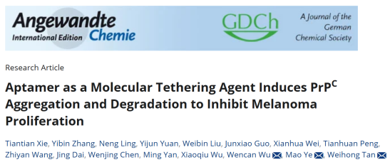 近日,诸侯快讯ok1122谭蔚泓院士/叶茂教授团队在Angewandte Chemie International Edition在线发表了题为“Aptamer as a molecular tethering agent induces PrPC aggregation and degradation to inhibit melanoma proliferation”的研究论文。该研究首次证实,基于核酸适体构建的分子束缚剂,可通过诱导黑色素瘤中细胞阮蛋白(PrPC)的非天然聚集,激活细胞内蛋白质量控制系统,促进PrPC的溶酶体途径降解,实现抗黑色素瘤的功能活性。这一研究不仅为开发靶向PrPC的抗肿瘤药物奠定了理论基础,而且为发展新型靶向蛋白降解策略提供了重要科学依据。