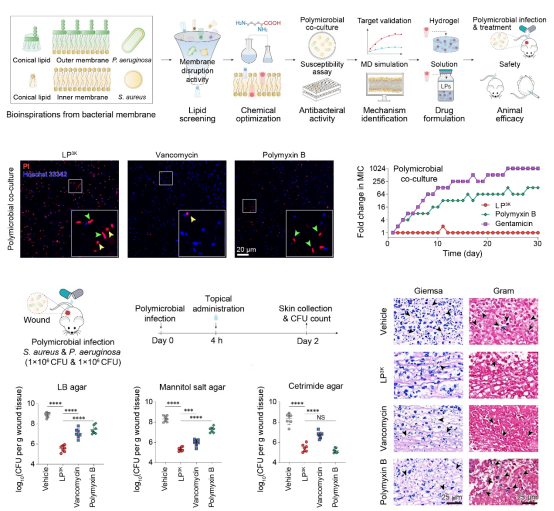 研究团队聚焦于革兰氏阳性菌与革兰氏阴性菌细胞膜在组成与结构上的共性特征,重点关注细菌细胞膜中广泛存在的锥形脂质(如脂质A、磷脂酰乙醇胺等)及其双分子层结构。细胞在分裂、出芽等过程中,膜脂组成及比例的动态变化对生命活动具有关键作用。受到生物启发,研究团队提出了倒锥形脂肽分子的设计理念,利用几何拮抗的生物物理效应精准干预细菌细胞膜稳态,从而实现安全高效、低耐药风险的抗混合细菌感染策略。在研究中,团队通过高通量筛选获得脂质先导物,并以氨基酸为基元构建支化结构的倒锥形脂肽。研究发现,该类分子能够高效扰动革兰氏阳性菌和革兰氏阴性菌的细胞膜结构,展现出广谱且高效的抗感染作用,并且在连续30轮药物处理后仍未观察到耐药性发展。在分子细胞生物学及分子模拟水平,研究揭示了脂肽LP3K可快速吸附并插入细菌内膜和外膜,破坏膜完整性,引发细胞内容物泄漏、膜去极化及氧化应激反应,最终实现高效杀菌。在小鼠混合感染模型中,LP3K有效抑制了混合感染导致的细菌协同耐药与毒力增强等问题,其抗感染疗效显著优于临床常用的强效抗菌药物。同时,LP3K表现出良好的体内安全性,并已实现规模化制备,具备显著的转化应用前景。